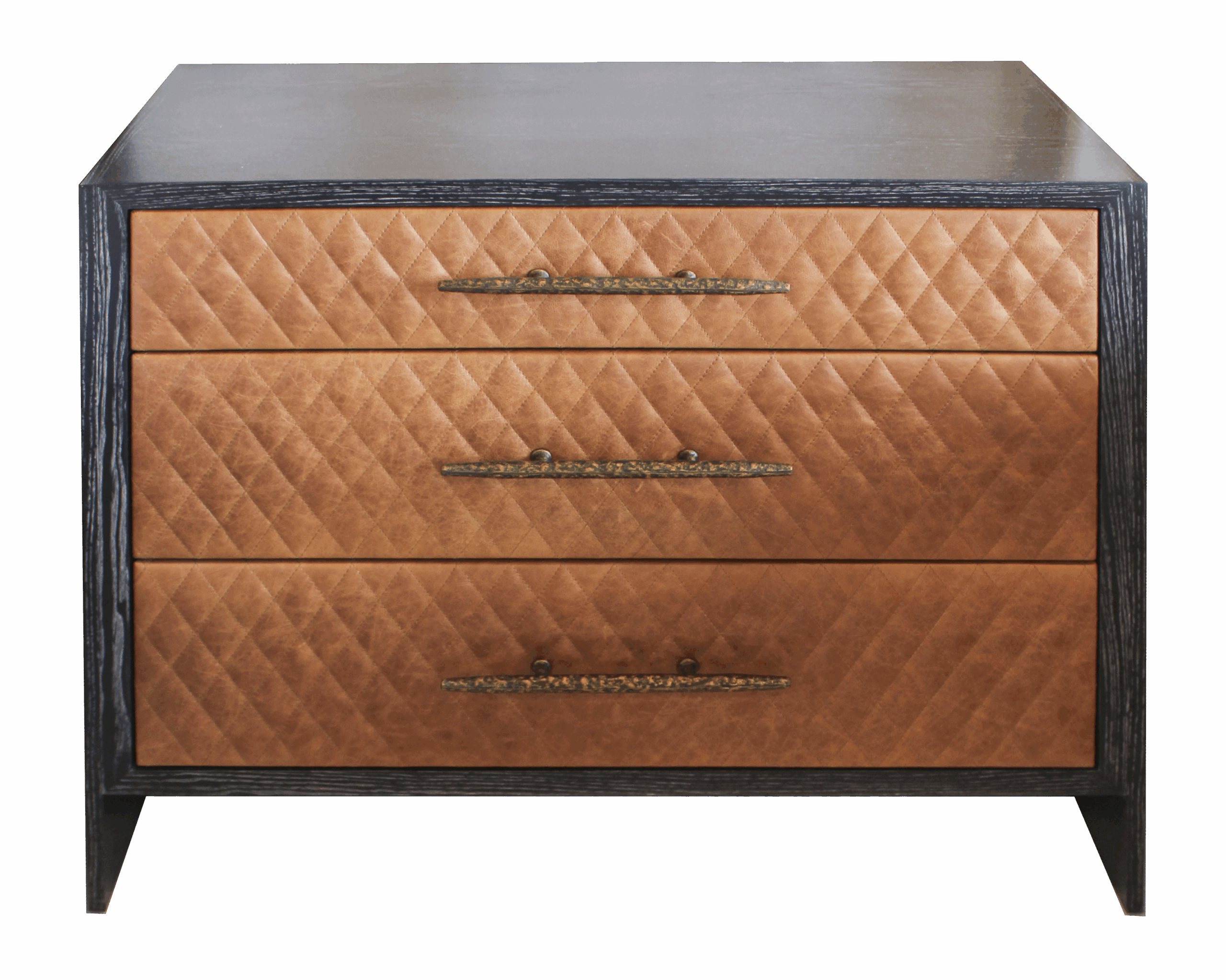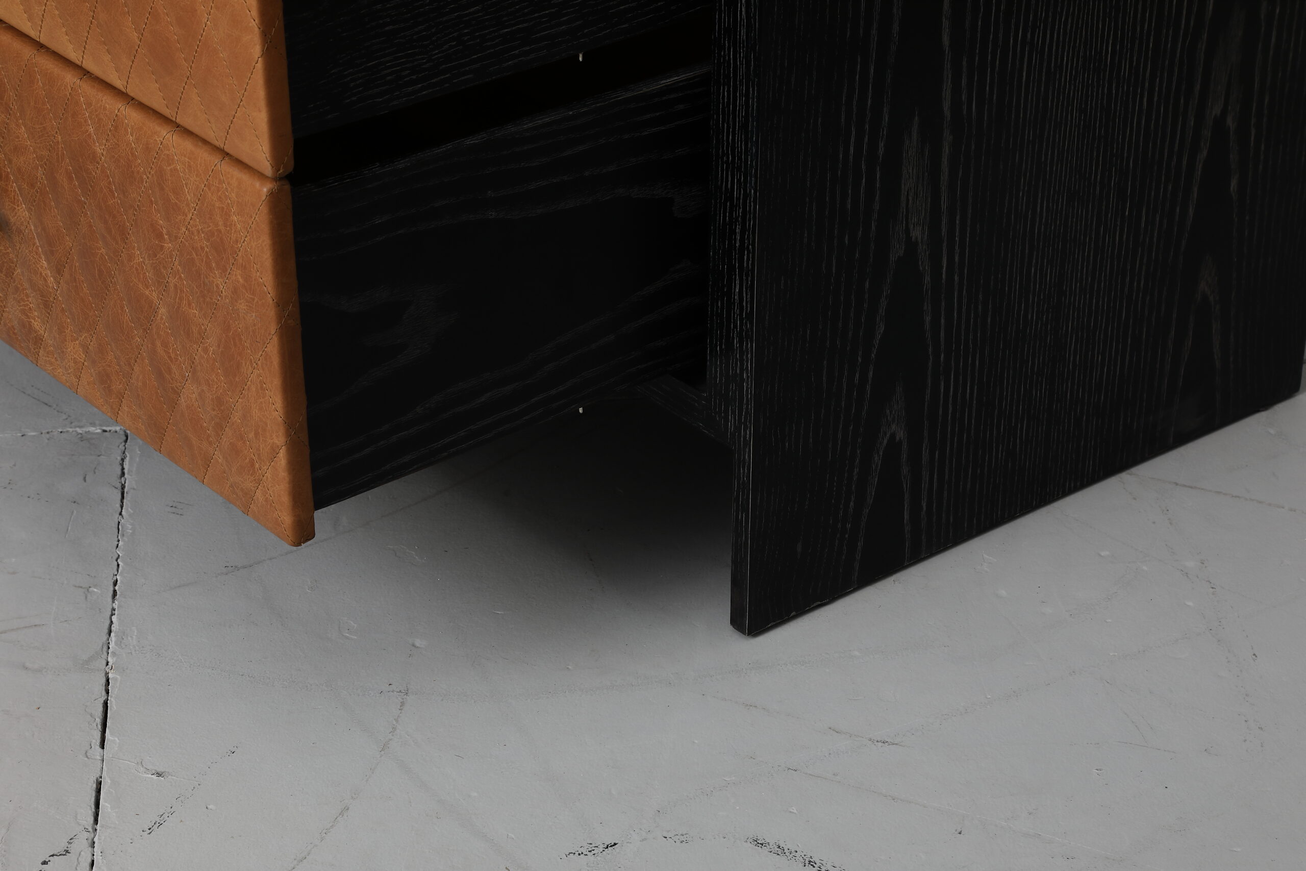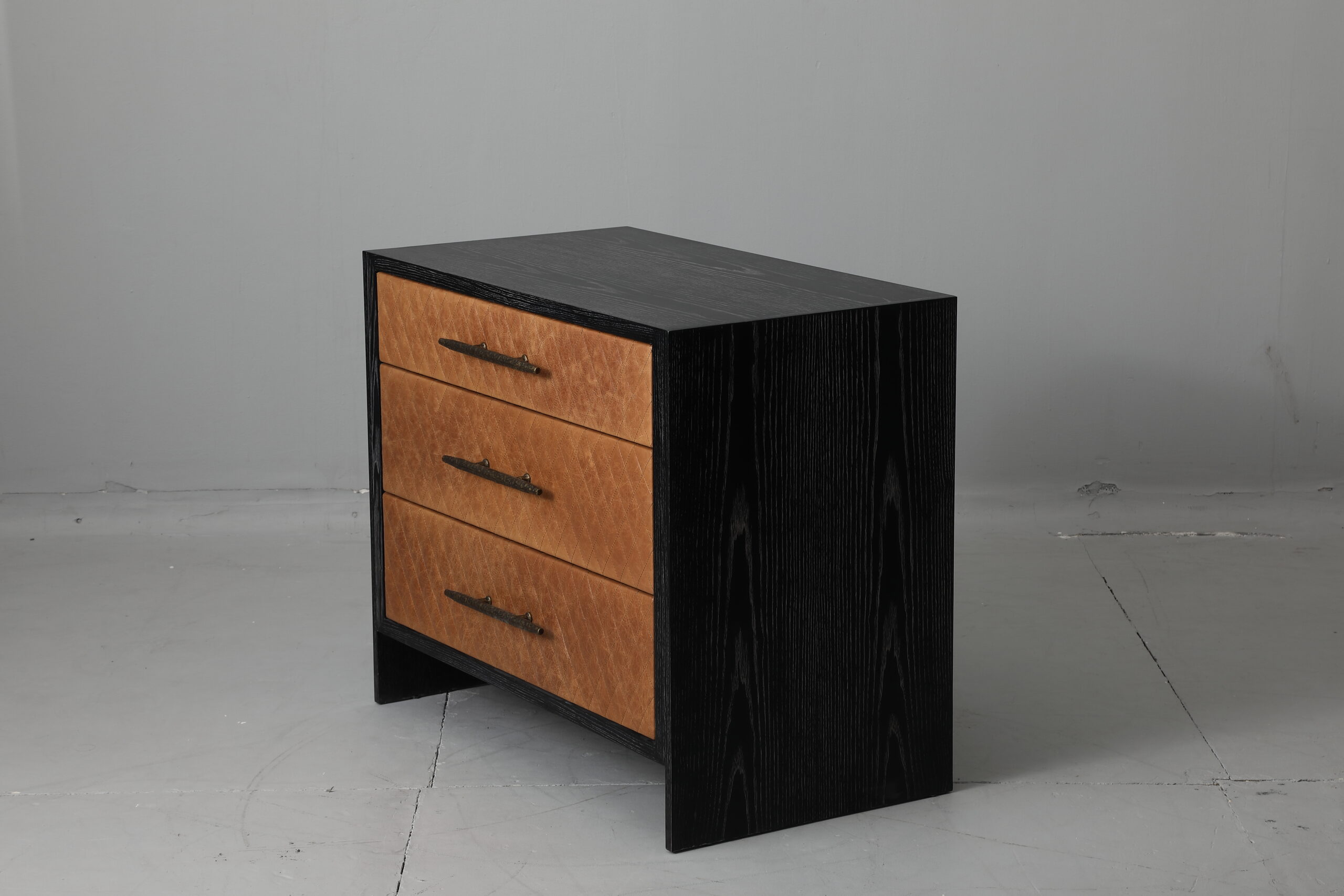 Finish: Black Limed Ash with Carmel Quilted Leather and Aged Brass Detail