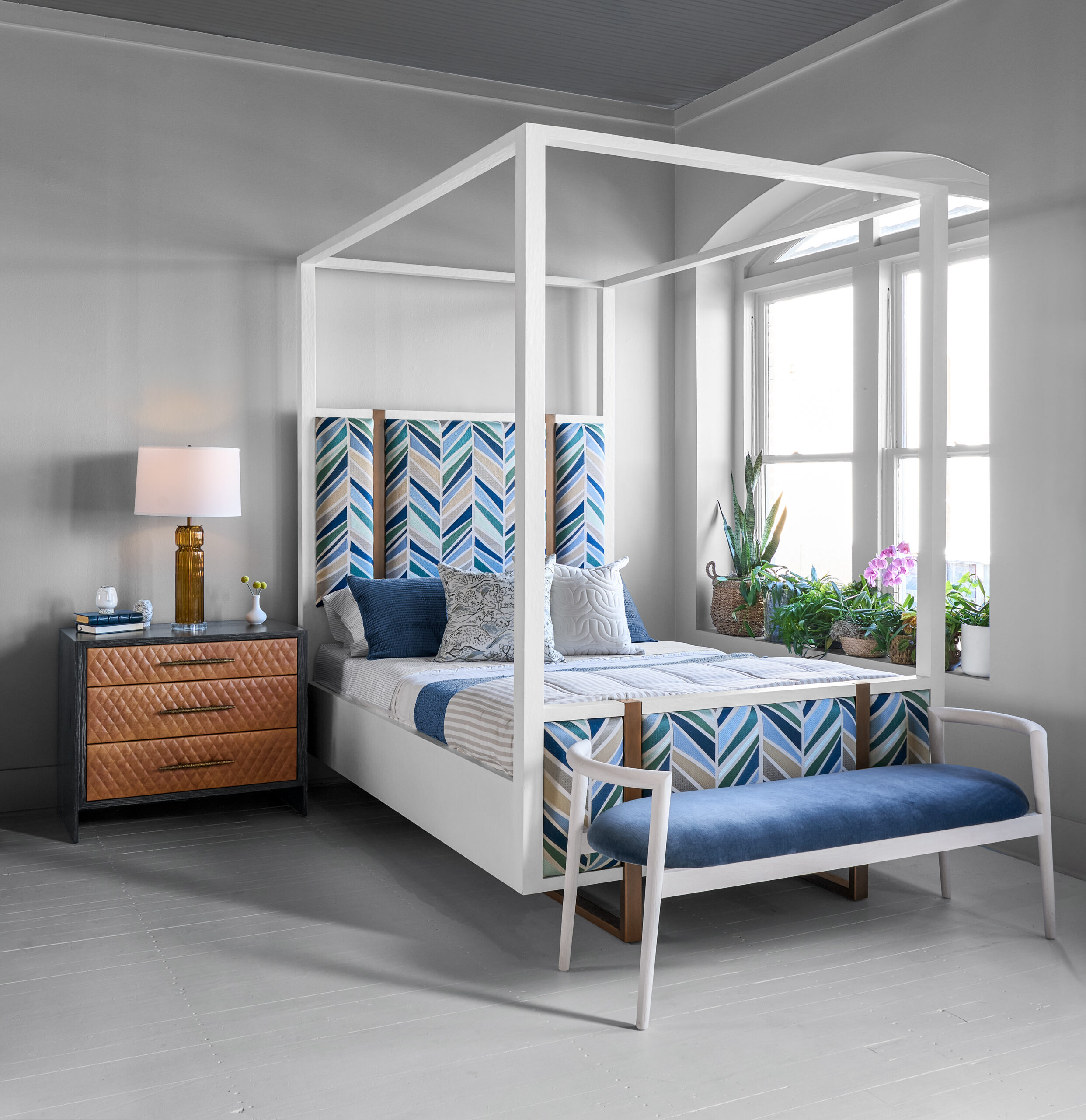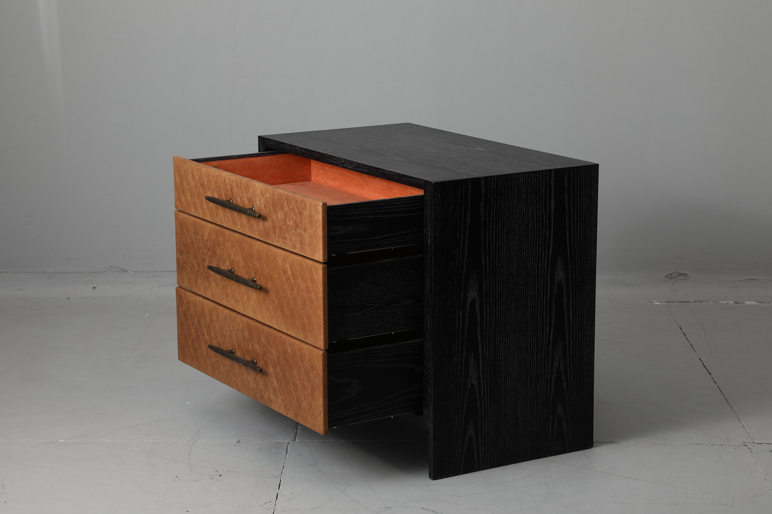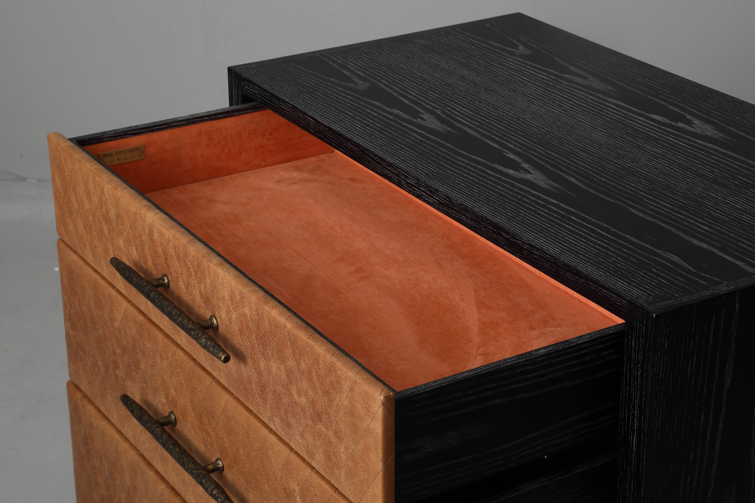 Finish: Black Limed Ash with Carmel Quilted Leather and Aged Brass Detail