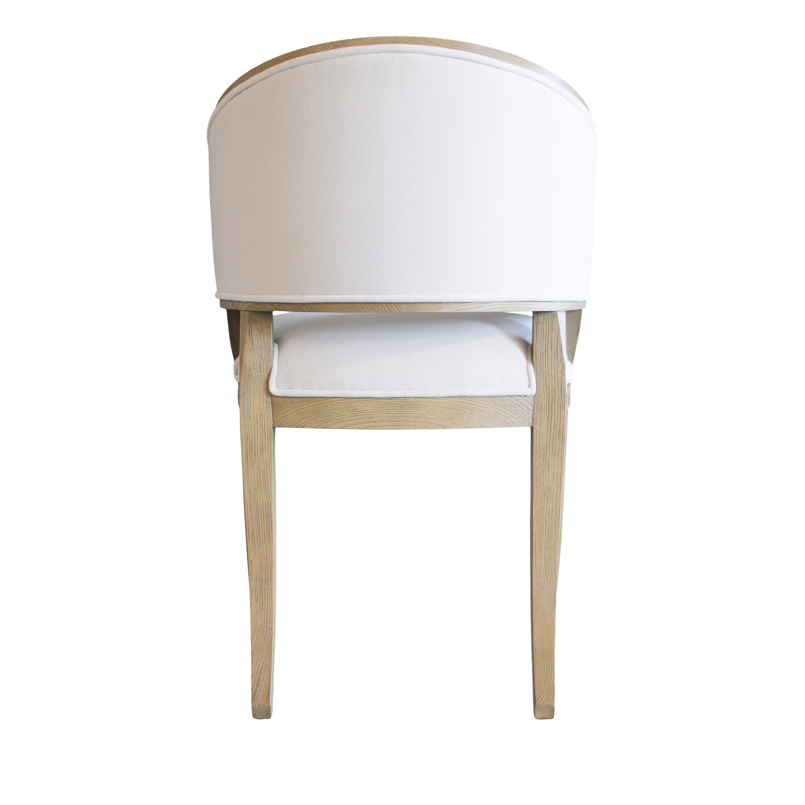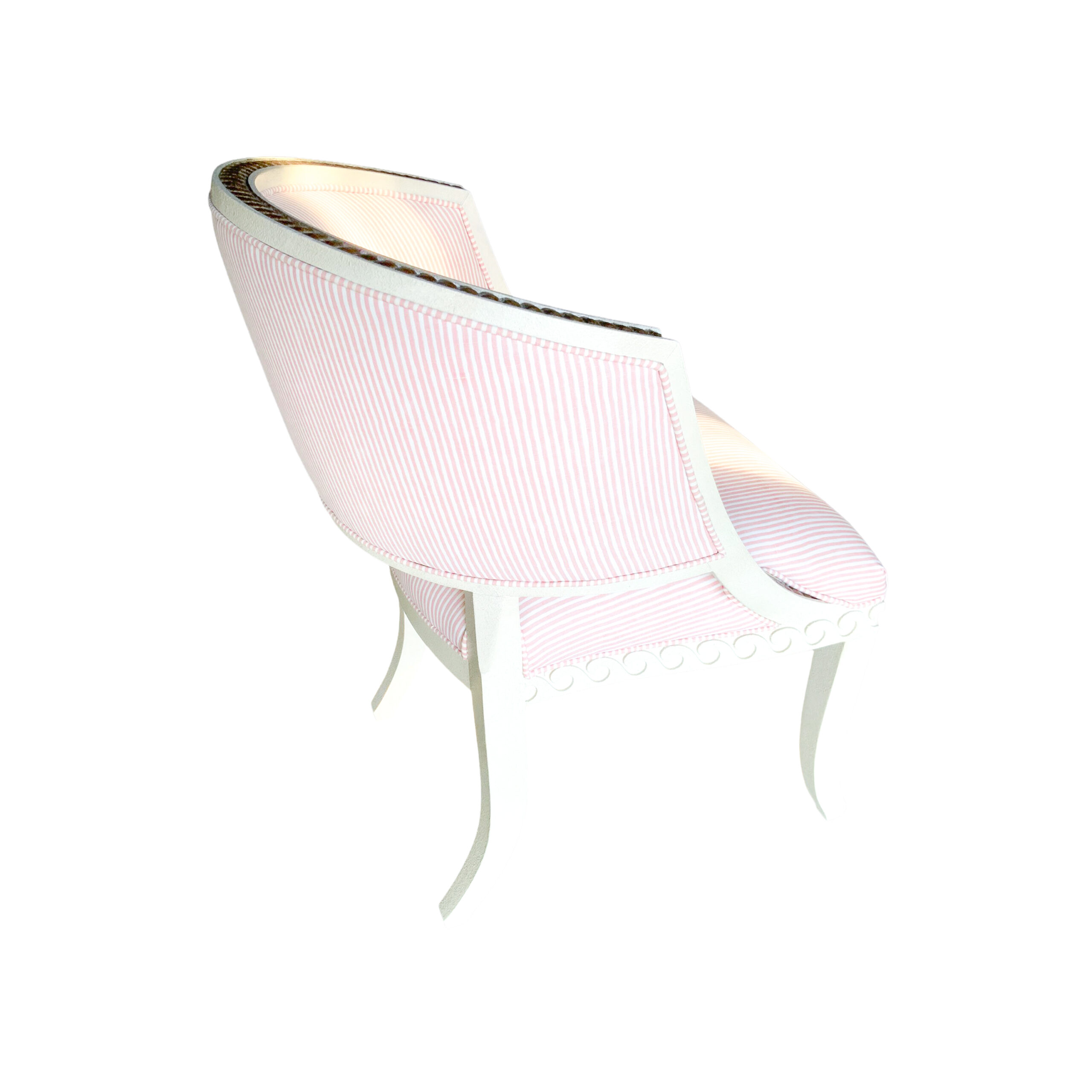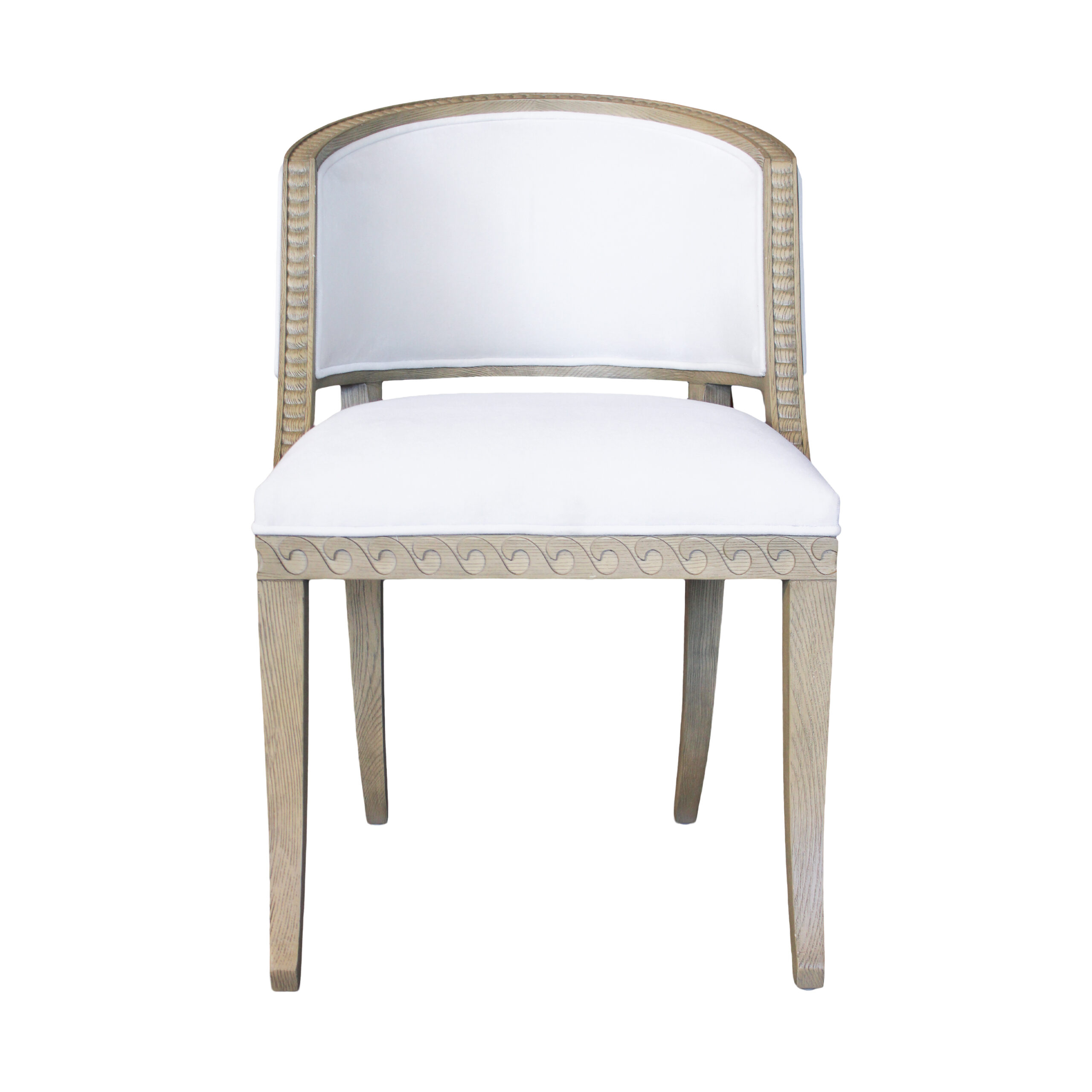 An adaptable elegant delicately carved Swedish side chair with a rounded upholstered back and seat on tapered, curved legs. Each piece is finished by hand by artisans and is unique.
